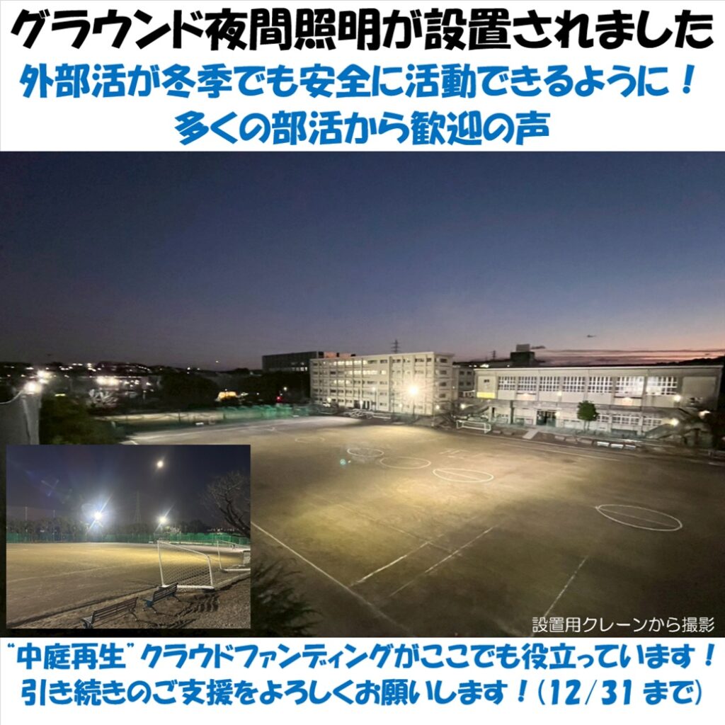 先週末、金井高校で、グラウンドに夜間活動用の照明設備を設置する工事がおこなわれました。これは、グラウンドの部活動が、練習できるようなレベルではなかった従来の照明に代わるものとして、冬季でも安全に部活動ができるような十分な照明の設置が長らく要望されていたものです。