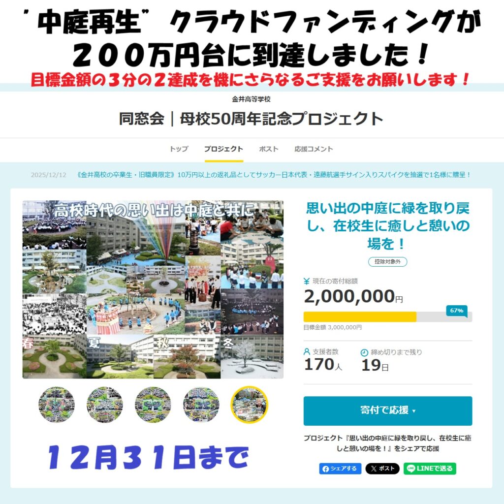 現在、12月31日までの予定で進行中の50周年記念プロジェクト「思い出の中庭に緑を取り戻し、在校生に癒しと憩いの場を!」累計寄付額が、本日、目標金額の3分の2にあたる200万円に到達しました。まずは、皆さんのこれまでのご支援に感謝いたします。