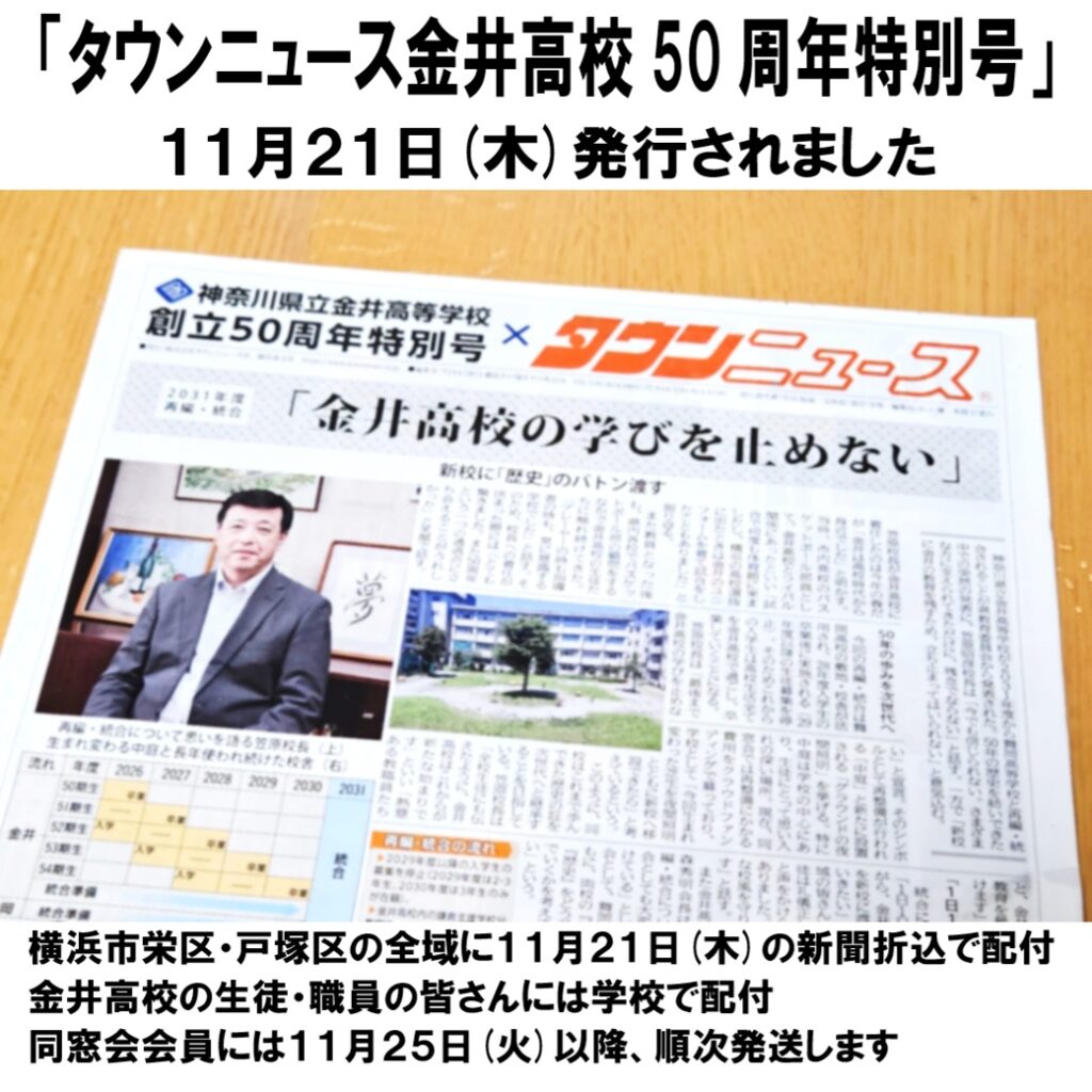 この特別号は、金井高校同窓会が、同窓生・学校関係者・近隣企業の皆様のご協賛(中面広告掲載)のもと、金井高校の生徒・職員・保護者・卒業生のご協力をいただいて、タウンニュース社に編集・発行していただいたものです。当初は、金井高校の“50周年を祝う”紙面になる予定でしたが、発行決定後に統合の発表があったため、“50周年を祝う”とともに、在校生とこれから金井高校に入学し、金井生として卒業していくことになる皆さんのために“金井高校の学びを止めない”ことをアピールする紙面とすることができました。