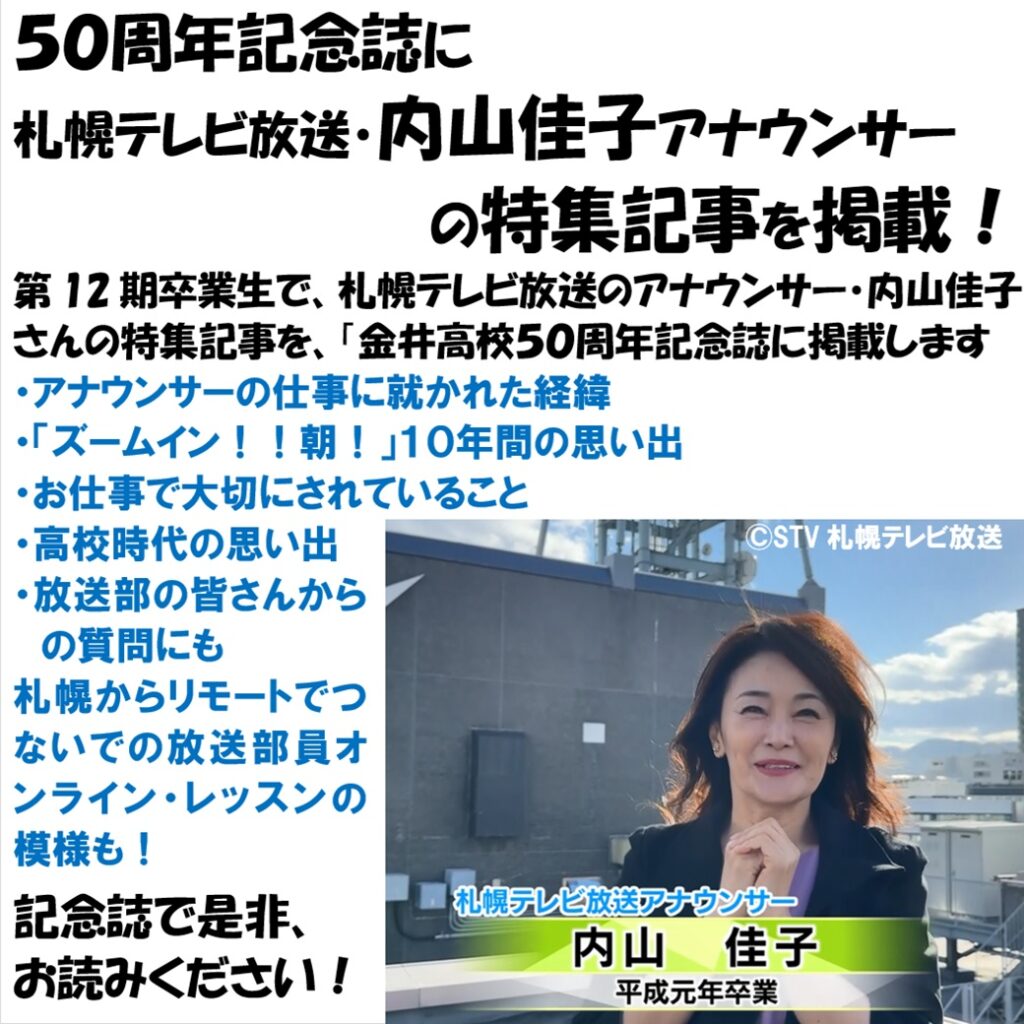 金井高校第12期卒業生で、札幌テレビ放送のアナウンサー・内山佳子さんの特集記事を、現在編集中の「金井高校50周年記念誌に掲載します。