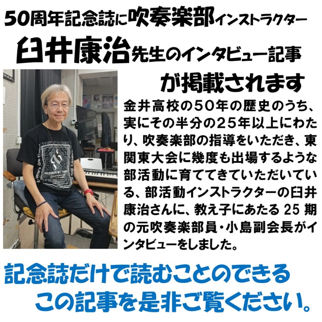 金井高校の50年の歴史のうち、実にその半分の25年以上にわたり、吹奏楽部の指導をいただき、東関東大会に幾度も出場するような部活動に育ててきていただいている、部活動インストラクターの臼井康治先生に、教え子にあたる25期の元吹奏楽部員・小島副会長がインタビューをしました。記念誌だけで読むことのできるこの記事を是非ご覧ください。