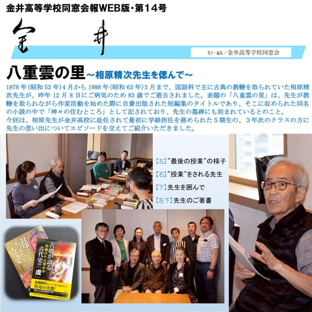 会報WEB版第14号をアップロードしました 第14号は、「八重雲の里~相原精次先生を偲んで~」です。 今回は、相原先生が金井高校に赴任されて最初に学級担任を務められた5期生の、3年次のクラスの方に先生の思い出についてエピソードを交えてご紹介いただきました。 会報WEB版14号2026/03/24発行(PDF文書)