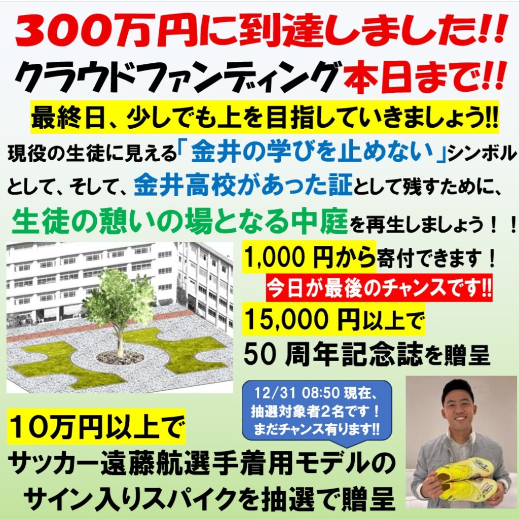 本日最終日となったクラウドファンディング・母校50周年記念プロジェクト「思い出の中庭に緑を取り戻し、在校生に癒しと憩いの場を!」は、昨夜、300万円に到達しました。