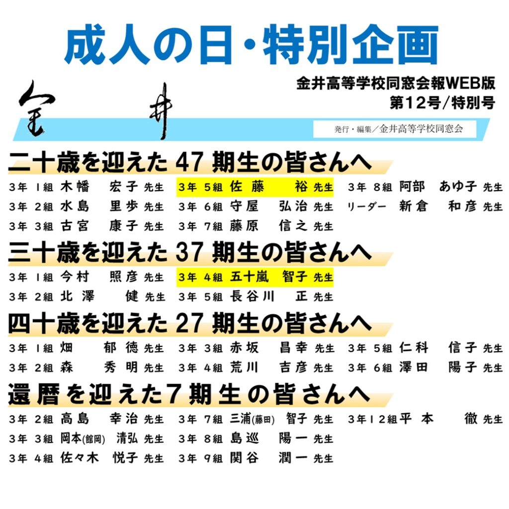 この企画は元々“二十歳のつどい”の行われる成人の日に合わせ、今年度二十歳を迎える47期生に向けて当時の担任団の先生方のメッセージを伝える、という同窓会の新しい試みとして企画されたものです。ちょうど6期の皆さんの”還暦同窓会”が開かれたこともあり、そらならばと、今年度〇十歳を迎えた皆さんを対象とすることとしました。