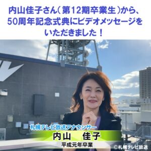 これに合わせて、金井高校第12期卒業生で札幌テレビ放送アナウンサーの内山佳子さんからビデオメッセージをいただきました。日本テレビ系列の「ズームイン朝!」などでも活躍されてきた内山さんのメッセージは、さながらテレビで生中継をしているかのような、楽しいビデオになりました。