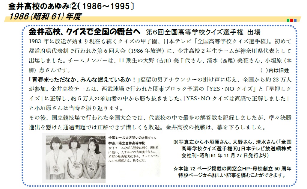記念誌のP.29に掲載のコラム「金井高校、クイズで全国の舞台へ 第6回全国高等学校クイズ選手権出場」について、WEB版同窓会報第13号として詳しく紹介しています。神奈川県代表を勝ち取った予選の様子から、全国大会の経過、後日譚まで、楽しい内容になっています。是非、ご覧ください。